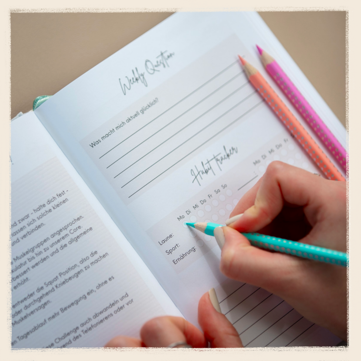 Der Habit Tracker hilft dir, deine Gewohnheiten mitzuverfolgen. Du kannst deine Laune, Ernährung und Sport tracken. Zusätzlich hast du noch drei freie Felder für persönliche Gewohnheiten.